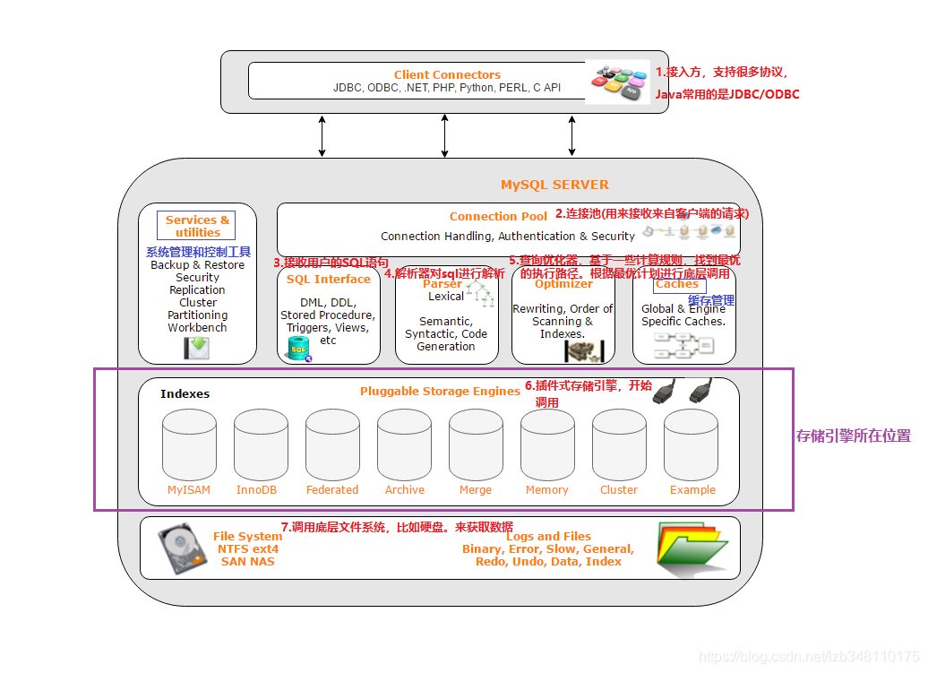 - 第三层-存储引擎层:包含了存储引擎。存储引擎负责MySQL中数据的存储和提取。和GNU/Linux下的各种文件系统一样,每个存储引擎都有它的优势和劣势。服务器通过API与存储引擎进行通信。这些接口屏蔽了不同存储引擎之间的差异,使得这些差异对上层的查询过程透明。存储引擎 API包含几十个底层函数,用于执行诸如”开始一个事务”或者”根据主键提取一行记录”等操作。但存储引擎不会去解析SQL,不同存储引擎之间也不会相互通信,而只是简单地响应上层服务器的请求。